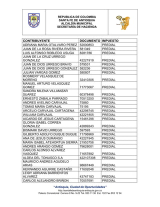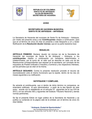 El documento es un aviso de la Secretaría de Hacienda del municipio de Santa Fe de Antioquia, Colombia. Declara a varios contribuyentes como deudores morosos por impuestos de predial unificado e industria y comercio. Los contribuyentes tienen 5 días para presentarse y recibir la notificación de la resolución, o de lo contrario se entenderá notificado el acto administrativo a partir de la desfijación del aviso.