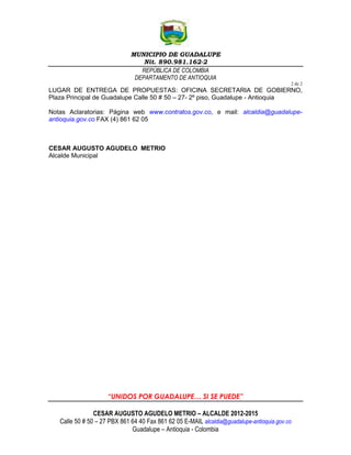 El documento anuncia una licitación pública para la construcción de pozos sépticos y mejoramientos de viviendas en el municipio de Guadalupe, Antioquia. La licitación se llevará a cabo el 8 de abril de 2013 y las propuestas deben ser entregadas antes del 20 de abril. Los interesados deben visitar obligatoriamente el sitio el 9 de abril y cumplir con los requisitos generales establecidos en los pliegos de condiciones como experiencia, capacidad financiera y técnica. El presupuesto oficial