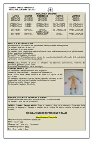 Este informativo semanal para el segundo año básico "B" del Colegio Camilo Henríquez detalla los requerimientos y actividades para la próxima semana. Incluye información sobre una salida pedagógica, materiales requeridos, horarios de clases y profesores, contenidos por asignatura, evaluaciones y enlaces de recursos adicionales.