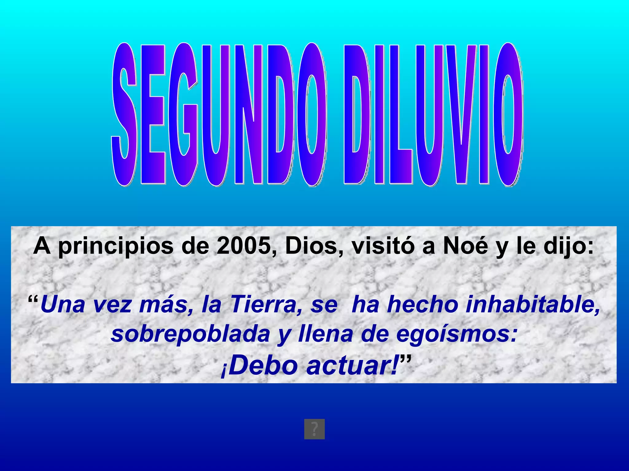 Dios le dijo a Noé que construyera un arca para salvar a las especies animales de un segundo diluvio, pero cuando regresó a los 6 meses, el arca aún no estaba construida. Noé explicó que necesitaba permisos, superar objeciones de vecinos y asociaciones, y cumplir con regulaciones laborales y tributarias, por lo que probablemente le llevaría más de 10 años terminar el arca. Dios decidió que no destruiría la Tierra, concluyendo que la burocracia se encargaría de eso.