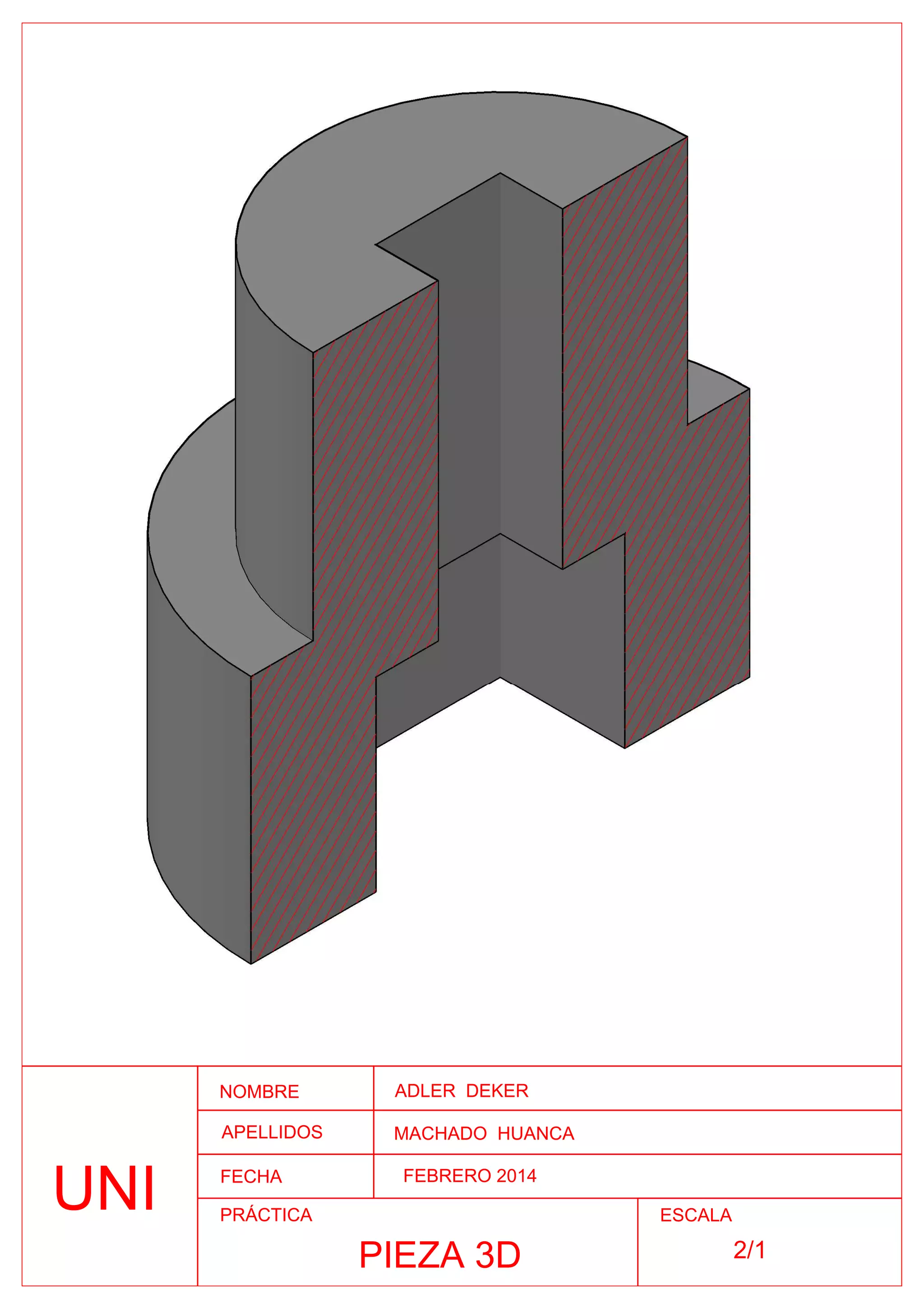 Un documento contiene el nombre y apellidos de dos personas, la universidad a la que asisten, la fecha de febrero de 2014 y se refiere a una pieza 3D impresa a escala 2/1.