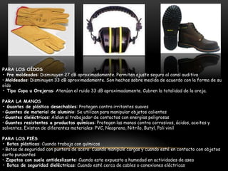 Este documento describe diferentes elementos de protección personal para la cabeza, ojos, cara, oídos, manos y pies que deben usarse en situaciones de riesgo en el trabajo. Detalla cascos, gafas, caretas, premoldeados, guantes de diferentes materiales, y botas para protegerse de golpes, químicos, calor, electricidad, y otros peligros.