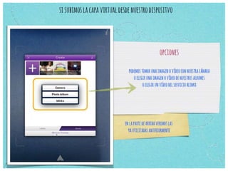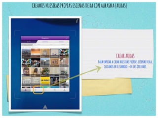 Este documento proporciona instrucciones sobre cómo instalar y usar la aplicación Aurasma en un teléfono inteligente o tableta. Explica cómo buscar e instalar la aplicación, crear una cuenta, y luego apuntar el dispositivo a una imagen para activar el contenido aumentado asociado. También define términos clave como "triggers", "overlays", y "aura", e invita a los lectores a crear su propio ejemplo para usar con sus cursos.