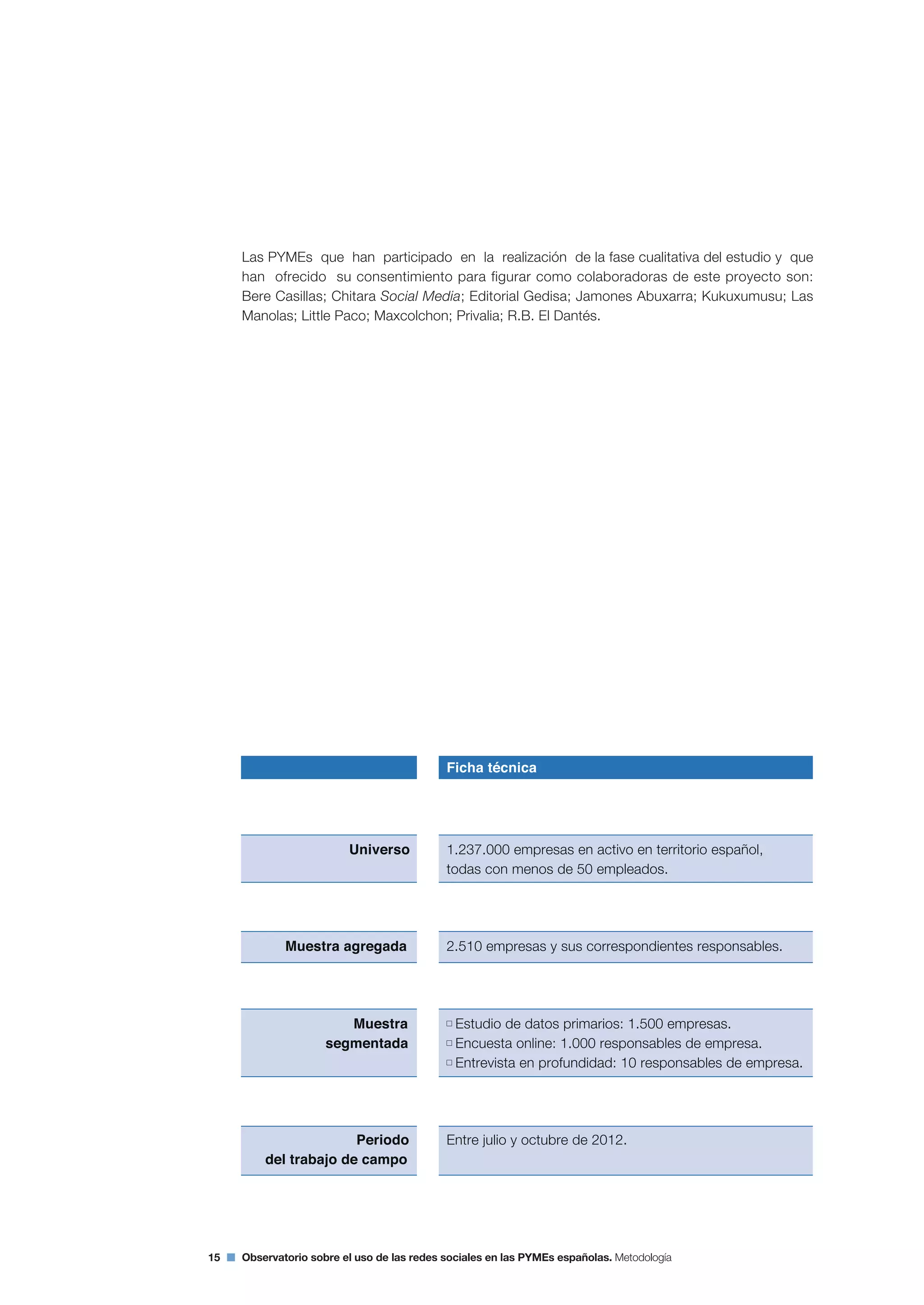 El informe analiza el uso de redes sociales por parte de las pymes españolas, mostrando un crecimiento en la adopción, donde el 55.3% de las empresas ya las utilizan profesionalmente, especialmente en el sector servicios. Facebook es la plataforma más utilizada, y se observa una mejora en la frecuencia de actualización de perfiles y en la profesionalización del uso de estas herramientas. Además, el estudio identifica áreas de mejora y expectativas sobre el futuro uso de redes sociales en las empresas.