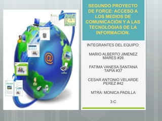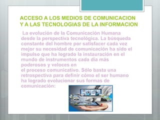El documento presenta un proyecto sobre acceso a medios de comunicación y tecnologías de la información realizado por tres estudiantes y su maestra. Explica brevemente la evolución de la comunicación humana desde métodos primitivos hasta la actualidad, destacando que los avances tecnológicos han permitido un mayor acceso a la información.