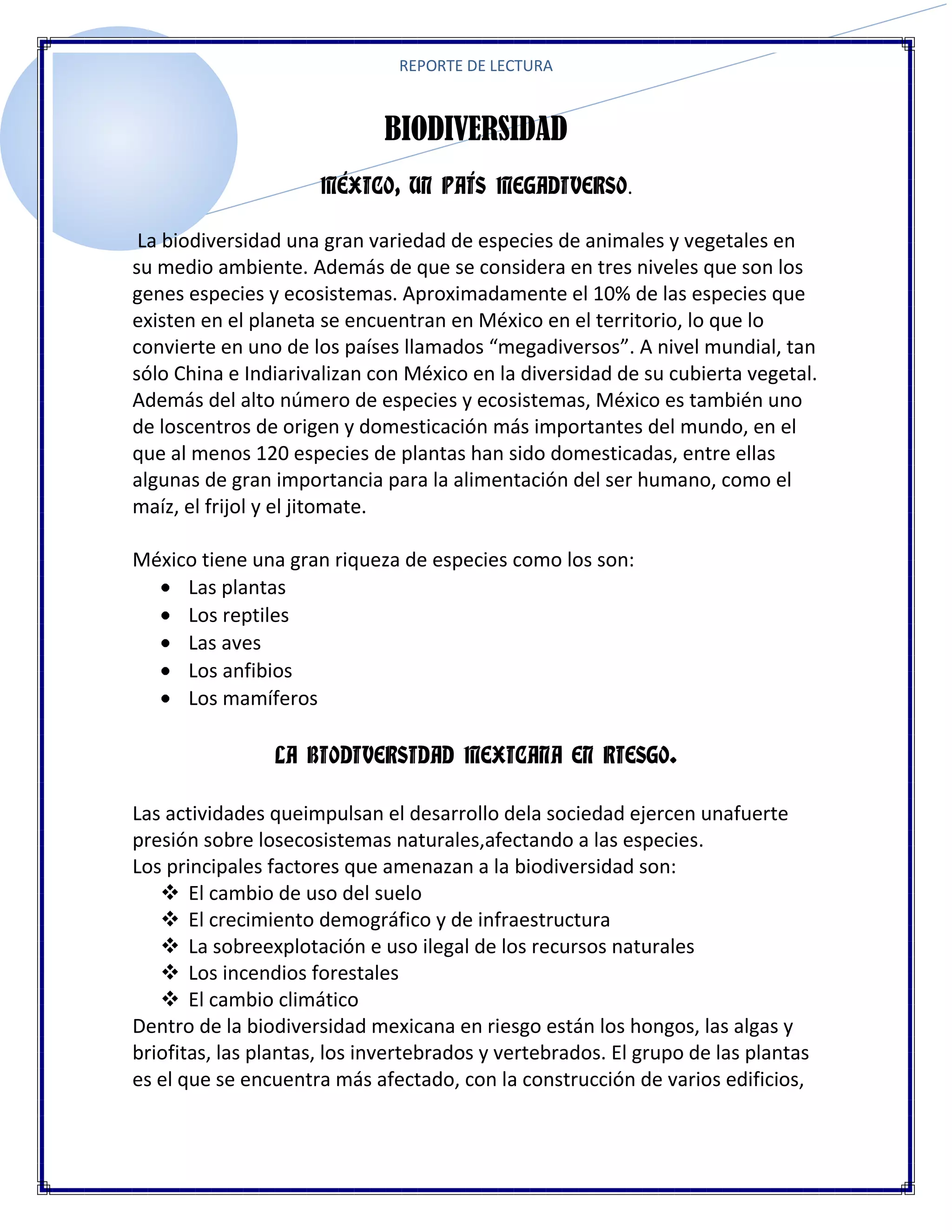 México es uno de los países más megadiversos del mundo, albergando al 10% de las especies mundiales en su territorio. Sin embargo, la biodiversidad mexicana se encuentra en riesgo debido a factores como el cambio de uso del suelo, el crecimiento demográfico, la sobreexplotación de recursos y el cambio climático. El documento describe algunos ecosistemas amenazados como los manglares, arrecifes de coral y especies en peligro de extinción, e identifica programas y áreas protegidas para la conservación de