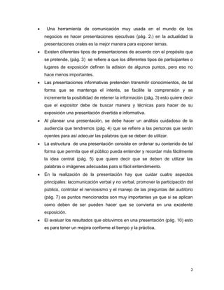 La guía explica las tres etapas clave para realizar presentaciones orales exitosas: planeación, realización y evaluación. Se divide en seis partes que detallan cómo planear el tema, analizar la audiencia, elegir el formato y apoyos visuales, así como técnicas para la presentación y evaluación posterior. El objetivo es proveer una herramienta útil para maestros y estudiantes.
