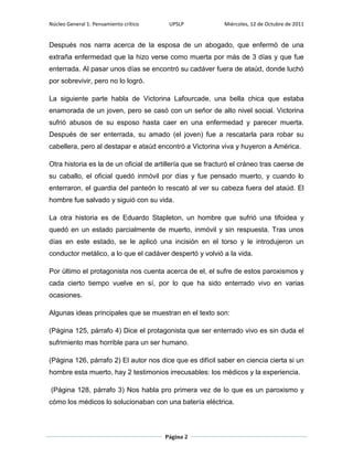 Este documento resume el cuento "Enterrado vivo" de la colección "Narraciones extraordinarias" de Edgar Allan Poe. Narra la historia de varias personas que parecían haber muerto pero fueron enterradas vivas, incluyendo una mujer, un joven, un oficial y el protagonista, quien sufre de paroxismos que lo hacen parecer muerto. El cuento explora el terror de ser enterrado vivo y la dificultad de determinar con certeza si alguien ha muerto.