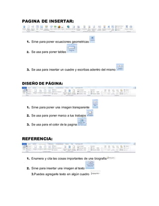 Este documento presenta las funciones de varias barras de herramientas y pestañas de un programa de oficina. Incluye secciones como Página de inicio, Insertar, Diseño de página, Referencia, Correspondencia, Revisar y Vista, cada una con 3 funciones brevemente descritas.