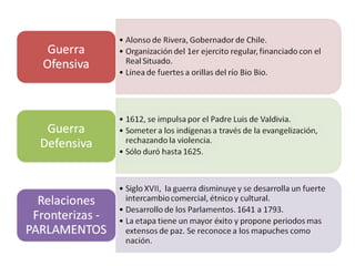 La Guerra de Arauco fue un enfrentamiento de 350 años entre españoles y mapuches al sur del río Biobío en la Araucanía desde el siglo XVI hasta el siglo XIX. El gobierno colonial español en América se organizaba a través del Consejo de Indias en España y virreinatos y gobernaciones en América, mientras que Chile era administrado como una capitanía general.