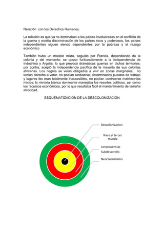Las causas de la descolonización incluyen la difusión de ideologías democráticas y el deseo de soberanía e independencia entre los pueblos colonizados, así como las posturas anticolonialistas promovidas por Woodrow Wilson y las Naciones Unidas. Las consecuencias fueron el surgimiento de un "Tercer Mundo" marcado por el subdesarrollo, la pobreza, el neocolonialismo y la dependencia económica de los países ricos. Esto llevó a violaciones de derechos humanos como la discriminación y falta de dere