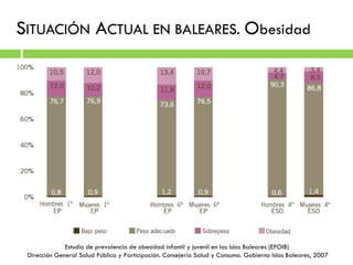 El documento habla sobre la alimentación saludable para niños. Explica que en las Islas Baleares el 35% de la energía diaria de los niños debería provenir de las comidas servidas en los centros educativos. Incluye ejemplos de menús y raciones recomendadas según la edad, así como consideraciones sobre los diferentes grupos de alimentos y una alimentación equilibrada.