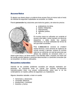 El documento habla sobre la seguridad física y lógica en sistemas informáticos. La seguridad física se refiere a las barreras para proteger el hardware de amenazas, mientras que la seguridad lógica usa controles de acceso para proteger la información almacenada. Algunas medidas de seguridad física incluyen control de acceso, cámaras y protección contra desastres naturales, mientras que la seguridad lógica usa identificación, roles y niveles de acceso para restringir el