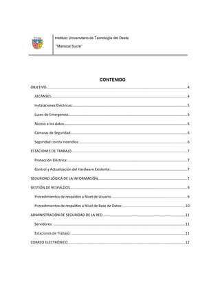 El manual de seguridad informática describe las políticas y procedimientos para proteger la información, usuarios y red de una organización pública. Incluye medidas de seguridad física como instalaciones eléctricas independientes, luces de emergencia y cámaras de seguridad, así como lógica mediante controles de acceso y respaldos periódicos. También establece lineamientos para administrar servidores, estaciones de trabajo y correo electrónico de forma segura.