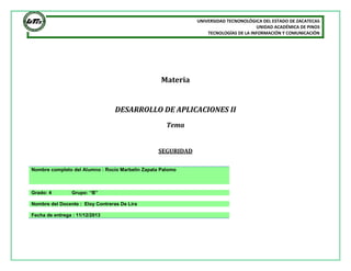 El documento describe los conceptos de seguridad en aplicaciones, incluyendo usuarios de aplicaciones, roles de aplicaciones, y amenazas como la inyección de código. Explica que las aplicaciones requieren permisos de usuarios para ejecutarse y que hay dos tipos principales de usuarios: estándar y administrador general. También cubre el uso de entidades de seguridad de base de datos y el método SP_Setapprole para habilitar roles de aplicaciones.
