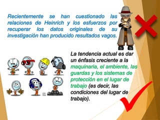 El documento describe la historia del enfoque de atribuir los accidentes laborales principalmente a los actos inseguros de los trabajadores. Este enfoque se originó con los estudios pioneros de H.W. Heinrich en la década de 1930, pero análisis más profundos ahora enfatizan la importancia de los controles de ingeniería para prevenir accidentes mediante el rediseño de procesos de trabajo peligrosos.