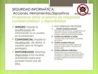 Este documento describe los conceptos básicos de seguridad informática, incluyendo las amenazas comunes como virus, gusanos y troyanos, y las herramientas de seguridad como antivirus, cortafuegos y software antiespía. Explica que la seguridad informática tiene como objetivo proteger la integridad, confidencialidad y disponibilidad de los sistemas mediante técnicas activas como contraseñas y encriptación y técnicas pasivas como copias de seguridad. También describe los diferentes tipos de software malicioso