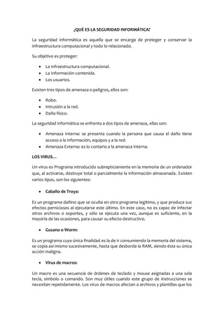 La seguridad informática se encarga de proteger la infraestructura computacional, la información y los usuarios de amenazas internas y externas como el robo, la intrusión a la red y el daño físico. Existen varios tipos de virus como caballos de Troya, gusanos, virus de macros, virus de sobreescritura y virus mutantes o polimórficos que intentan dañar la información. Algunas técnicas de protección incluyen usar contraseñas seguras, encriptar datos, mantener los antivirus actualizados y realizar