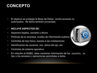 El documento habla sobre conceptos de seguridad en bases de datos. Explica que la seguridad busca proteger la base de datos contra accesos no autorizados a través de controles de acceso, usuarios y privilegios. También describe posibles amenazas como virus, caballos de troya u otros ataques que podrían comprometer la seguridad.