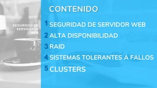 El documento aborda la seguridad de los servidores web, destacando la importancia de la protección contra amenazas como ataques pasivos y activos, así como la necesidad de implementar políticas de seguridad estrictas. También se discute la alta disponibilidad y la tecnología RAID, que asegura la continuidad operativa y la tolerancia a fallos. Se mencionan ventajas y desventajas de estas tecnologías, así como su impacto en el rendimiento y la seguridad empresarial.