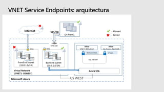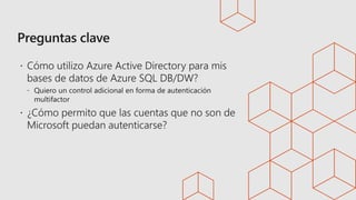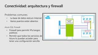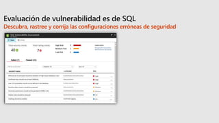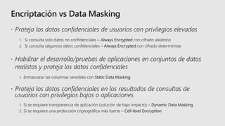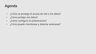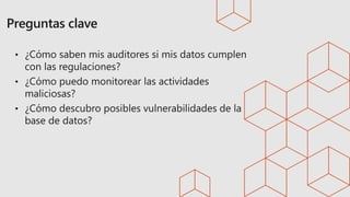El documento detalla diversas medidas de seguridad y características para bases de datos en Azure, incluyendo cifrado, autenticación, detección de amenazas y protección de datos. También se menciona la vulnerabilidad, la gestión de accesos y la importancia de cumplir con regulaciones en la industria de la ciberseguridad. Además, se enfatiza en la compatibilidad con SQL Server y la integración de herramientas para la administración y protección de datos confidenciales.