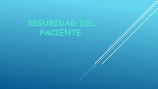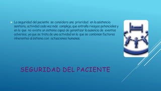 Este documento trata sobre la seguridad del paciente. Define la seguridad del paciente como el conjunto de elementos que propenden por minimizar el riesgo de eventos adversos durante la atención médica. Describe la Alianza Mundial para la Seguridad del Paciente creada por la OMS para coordinar esfuerzos internacionales. Explica que hasta 1 de cada 10 pacientes sufre daños en los hospitales y que los riesgos son mayores en países en desarrollo. Presenta lineamientos colombianos sobre buenas prácticas para la segur