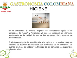 El documento trata sobre la importancia de la higiene en la cocina. Explica que la higiene se refiere a la salud y limpieza, y que es fundamental para prevenir enfermedades. También describe algunos hábitos esenciales de higiene como comprar alimentos en lugares confiables, mantener una temperatura adecuada en la nevera, y cocinar completamente los alimentos para eliminar gérmenes. Además, enfatiza la necesidad de evitar la contaminación cruzada y mantener limpia la cocina.