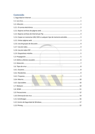 El documento describe los diferentes métodos por los cuales los virus informáticos pueden infectar ordenadores, incluyendo el correo electrónico, las descargas de archivos, las memorias USB y las páginas web. Explica cómo se propagan los virus de un ordenador a otro y los daños que pueden causar, como destruir archivos o robar información confidencial. También describe los diferentes tipos de virus y formas de detectarlos y eliminarlos.