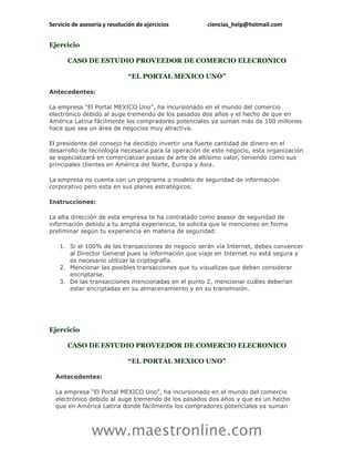 Este documento ofrece servicios de asesoría y resolución de ejercicios relacionados con ciencias. Proporciona un correo electrónico y sitio web para cotizaciones. Además, presenta varios ejercicios de caso sobre seguridad de la información para empresas de comercio electrónico, laboratorios médicos y bancos.