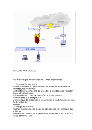 Este documento describe la importancia de implementar un firewall para proteger una red contra accesos no autorizados desde Internet. Un firewall se coloca entre la red interna y la conexión exterior y controla las entradas y salidas de datos, reduciendo significativamente las posibilidades de ataques exitosos. Se recomienda utilizar un dispositivo de hardware en lugar de un ordenador como firewall, ya que es menos susceptible de ser identificado externamente y se puede administrar de forma remota.