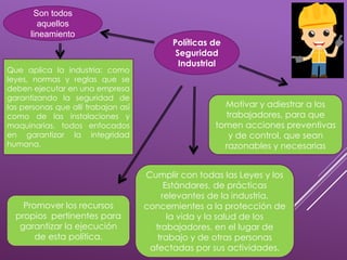 Este documento describe la organización y planificación de la seguridad industrial en una empresa. Explica que la seguridad industrial aplica leyes y normas para garantizar la seguridad de los trabajadores, las instalaciones y la maquinaria. También describe los diferentes tipos de organización de seguridad industrial, incluidos los roles del gerente, supervisor, técnico de seguridad y comité de seguridad. Finalmente, explica las responsabilidades de seguridad a diferentes niveles de la organización.