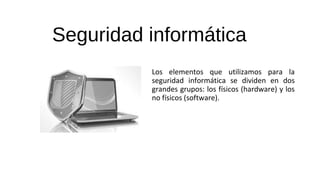 El documento describe los elementos de seguridad informática físicos y no físicos, incluyendo estabilizadores de tensión, antivirus, firewalls, y contraseñas. Explica cómo los virus pueden ingresar a sistemas y cómo programas como antivirus y firewalls ayudan a protegerlos. También define términos como hacker, cracker e intranet.