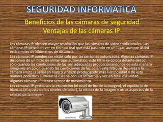 Las cámaras de seguridad brindan mayor seguridad a las empresas al permitir monitorear los locales las 24 horas desde cualquier lugar, ya sea para prevenir robos o comprobar incidentes. Las cámaras IP ofrecen mayor resolución que las tradicionales y permiten ver en tiempo real y de manera remota, además de contar con filtros infrarrojos, detección de movimiento y ajustes de imagen. Se diferencian de las cámaras web en que no requieren estar conectadas a una PC para funcionar de manera autónoma a través