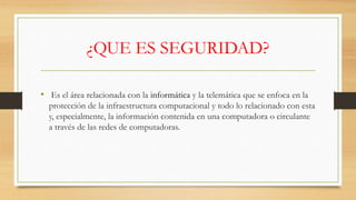 La seguridad informática se refiere a la protección de la infraestructura computacional y la información almacenada y transmitida a través de redes. La información se compone de datos procesados que comunican un mensaje y cambian el estado de conocimiento. Los activos de información son recursos utilizados por los sistemas de gestión de seguridad de la información para que las organizaciones funcionen y alcancen sus objetivos. La seguridad de la informática implica medidas para salvaguardar la confidencialidad, disponibilidad e integridad de los datos.