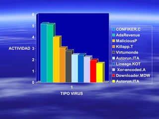 El documento describe varios tipos de amenazas informáticas como virus, troyanos, gusanos, spywares y rootkits. Explica que los virus se propagan al adjuntarse a otros programas o archivos, mientras que los gusanos y troyanos se ejecutan de forma oculta. También recomienda medidas de seguridad como realizar copias de seguridad, actualizar antivirus y analizar archivos descargados antes de abrirlos.