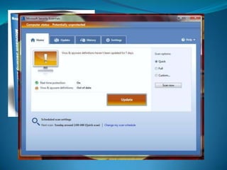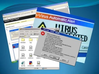 Este documento define qué son los virus informáticos, cómo se propagan e infectan otros archivos y sistemas. Explica que los virus se asemejan a los virus biológicos en cuanto a su capacidad de replicación y contagio. Describe las principales funciones y tipos de virus, así como las formas más comunes de infección y los métodos para prevenirlas, como el uso de antivirus y cortafuegos.