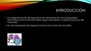 La seguridad informática es importante para proteger la infraestructura y la información de una organización. Sin embargo, existen varios obstáculos como la falta de conciencia de los usuarios, presupuesto limitado y apoyo insuficiente de la gerencia. Un sistema de seguridad efectivo requiere el diseño de controles que prevengan diferentes tipos de amenazas, ya sean intencionales o no intencionales, internas o externas.