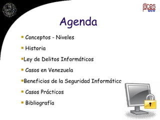 El documento presenta una introducción a la seguridad informática, incluyendo una historia breve, definiciones de conceptos clave, niveles de seguridad, detalles sobre la Ley de Delitos Informáticos de Venezuela y casos de seguridad informática en el país, además de bibliografía relacionada.