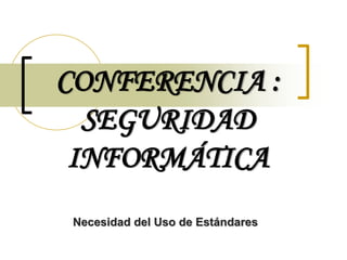 Este documento presenta una conferencia sobre seguridad informática. Explica la necesidad de seguir estándares como AS/NZS ISO/IEC 17799:2001 para la administración de la seguridad informática. Identifica obstáculos comunes como falta de conciencia y presupuesto. Luego describe las 10 áreas clave que cubre el estándar, incluyendo políticas de seguridad, seguridad organizacional, clasificación de activos, seguridad física y administración de operaciones.