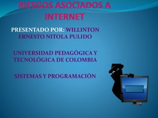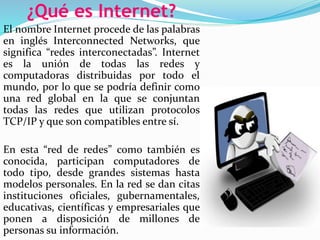 Internet es una red global de redes interconectadas que usan protocolos TCP/IP. Une computadoras y redes de todo tipo alrededor del mundo, permitiendo el intercambio de información. Ofrece beneficios como comunicación sencilla y bajos costos, acceso a información y personas de todo el mundo, pero también riesgos como acceso a contenido inadecuado y dependencia excesiva.