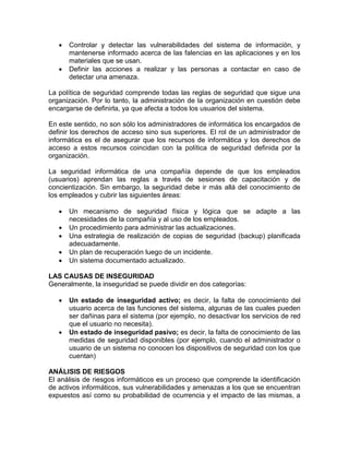 La seguridad informática se enfoca en proteger la infraestructura computacional y la información al minimizar riesgos a través de estándares, protocolos, métodos, herramientas y leyes. Los objetivos principales son garantizar la integridad, confidencialidad, disponibilidad y autenticación de los datos e implementar políticas de seguridad que identifiquen riesgos y establezcan reglas y procedimientos de acceso a la información.