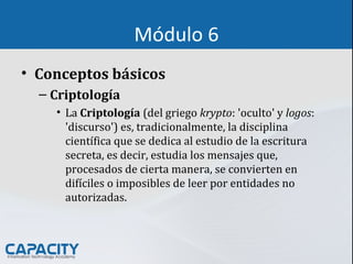 Este documento resume conceptos clave de criptografía como confidencialidad, cifrado simétrico y asimétrico, integridad, hashing y firma digital. Explica cómo la criptografía se usa para mantener la confidencialidad y la integridad de los mensajes mediante el uso de algoritmos como AES, RSA y Diffie-Hellman junto con llaves secretas. También describe la infraestructura de clave pública y cómo las firmas digitales proporcionan autenticación, no repudio e integridad.