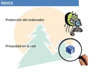 Este documento trata sobre la seguridad informática y la privacidad en la red. Explica la evolución de los virus informáticos y tipos como gusanos, bombas lógicas y troyanos. También describe formas de prevención como copias de seguridad, antivirus y cortafuegos. Finalmente, discute amenazas a la privacidad en internet como robo de identidad, pérdida de privacidad y espionaje en línea.