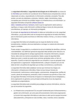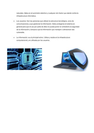 La seguridad informática se enfoca en proteger la infraestructura tecnológica, la información y los activos de una organización de amenazas mediante el establecimiento de normas, procedimientos y técnicas de seguridad. Estas incluyen la protección de software, hardware, datos y equipos físicos, así como la implementación de controles de acceso, perfiles de usuario, planes de contingencia y protocolos de seguridad. El objetivo es minimizar riesgos a la infraestructura y la información confidencial de una organización y asegurar un