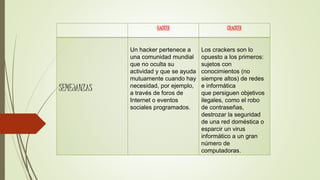 Este documento contiene información sobre varios temas relacionados con la seguridad informática, incluyendo hackers y crackers, los diez mandamientos del usuario en la red, las principales amenazas informáticas como virus y gusanos, y los diez mandamientos del administrador de la red. También describe brevemente a los detectives de seguridad informática y la autopsia informática.