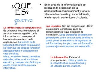 La seguridad informática se enfoca en proteger la infraestructura computacional y la información almacenada y compartida. Sus objetivos incluyen proteger a los usuarios, la infraestructura y la información de amenazas como fallas, robos, virus, phishing y troyanos. La seguridad pasiva minimiza daños mientras la activa evita amenazas mediante contraseñas, encriptación y software de seguridad.