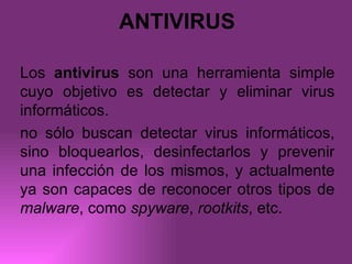 Este documento describe diferentes tipos de amenazas informáticas como virus, gusanos, troyanos, exploits, rootkits, keyloggers y ransomware. También explica medidas de seguridad como el uso de antivirus McAfee, Norton y Panda para detectar y eliminar estas amenazas. Finalmente, brinda detalles sobre las características y funcionalidades de estos tres populares antivirus.