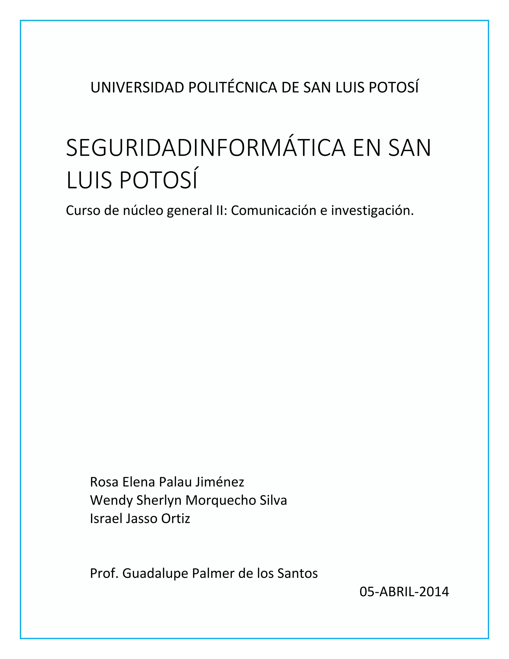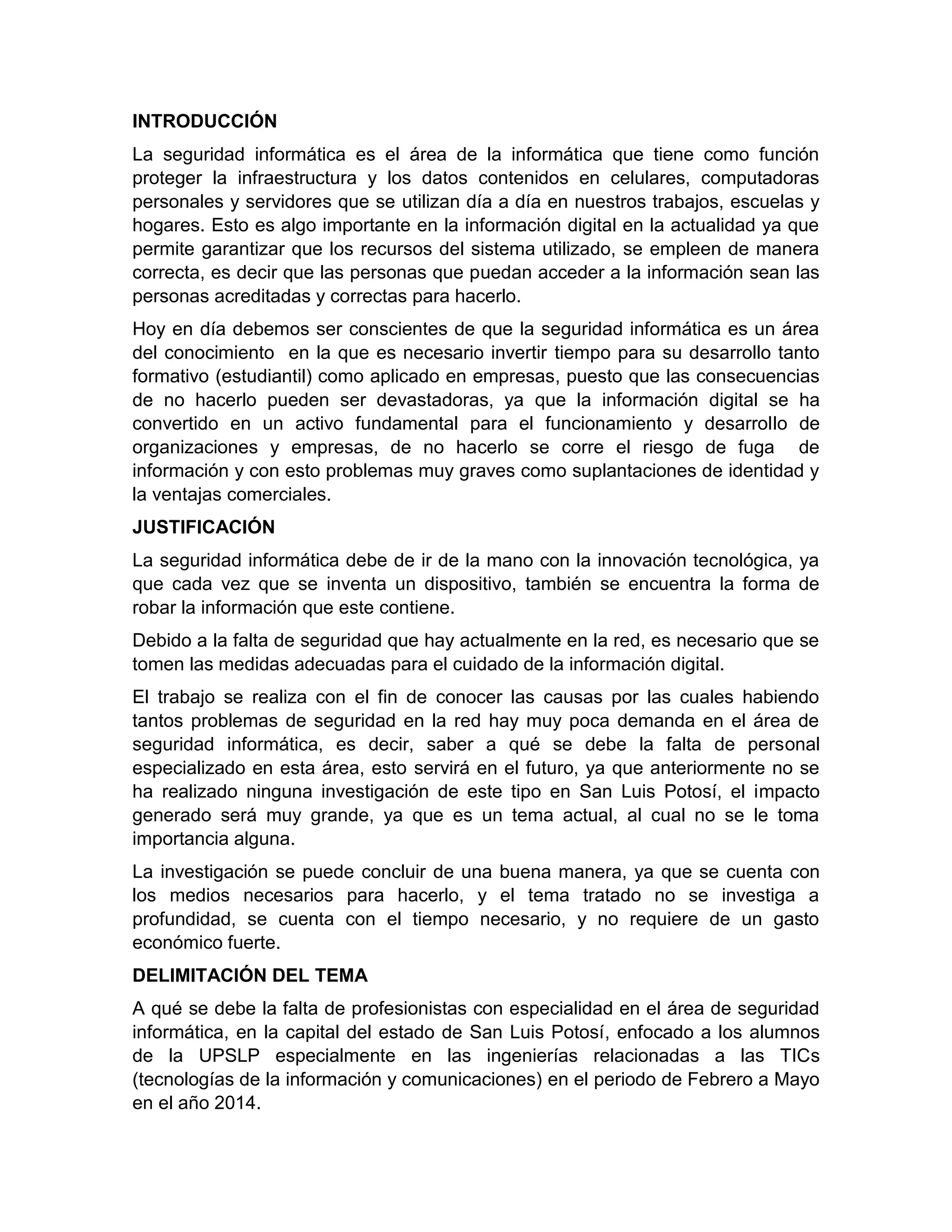 Este documento trata sobre la falta de seguridad informática en San Luis Potosí, México. Presenta una introducción al tema de la seguridad informática y su importancia. Luego, justifica la investigación al mencionar problemas actuales como falta de seguridad en la red y falta de una cultura de protección de datos. Detalla los objetivos de investigar las causas de la falta de profesionales especializados en seguridad informática en la región. Finalmente, presenta antecedentes sobre el tema y el contexto legal e institucional relevante en México.