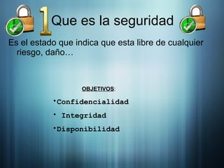 Este documento trata sobre la seguridad informática. Explica que la seguridad informática se refiere a proteger el hardware, software y datos de amenazas tanto pasivas como activas. Detalla algunas amenazas comunes como virus, malware y errores de software. También describe medidas de seguridad como el uso de contraseñas, antivirus, cortafuegos y realizar copias de seguridad para proteger los sistemas y recuperar la información en caso de fallos o ataques.
