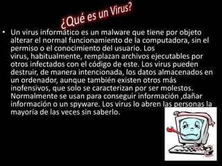 Este documento describe diferentes tipos de virus informáticos como troyanos, gusanos, virus de macros, virus de sobreescritura y más. También habla sobre personas apasionadas por la seguridad informática y sobre la importancia de la seguridad en las empresas para proteger información confidencial y sistemas.